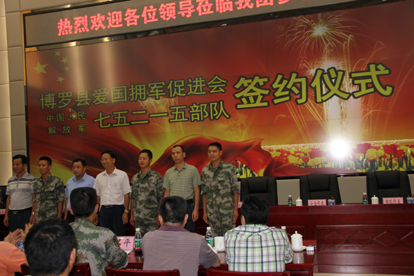 期間,縣愛國擁軍促進會與75215部隊簽約,結(jié)成“友好連隊”,縣愛國擁軍促進會所屬13家企業(yè)與75215部隊所屬25個分隊簽定合約,結(jié)為友好共建單位。羅浮山水泥集團與75215部隊70分隊(工兵連)結(jié)為友好共建單位,并當場為工兵連捐款1萬元建籃球場。